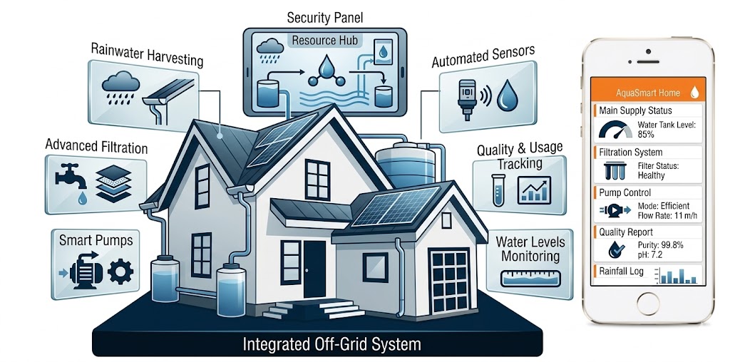 Water is no longer just “on demand” it’s intelligently managed. Off-grid homes now use rainwater harvesting systems, smart pumps, and advanced filtration technology to ensure clean and reliable water.